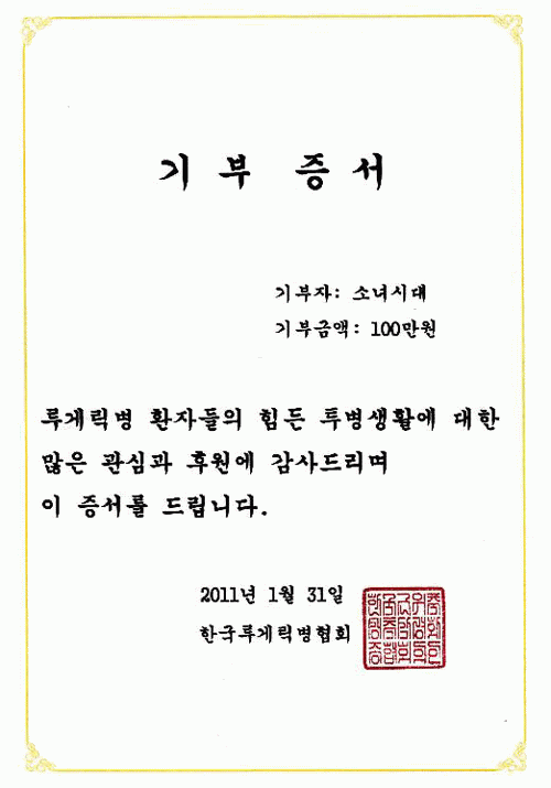 SONEs have joined hands and gathered their strength again to organize a donation drive to help the patients of Lou Gehrig’s Disease. SNSD’s online fan cafe members said, “In the name of SNSD, we have donated 1 million Won to the Korean ALS (Lou Gehrig’s Disease) Association“.